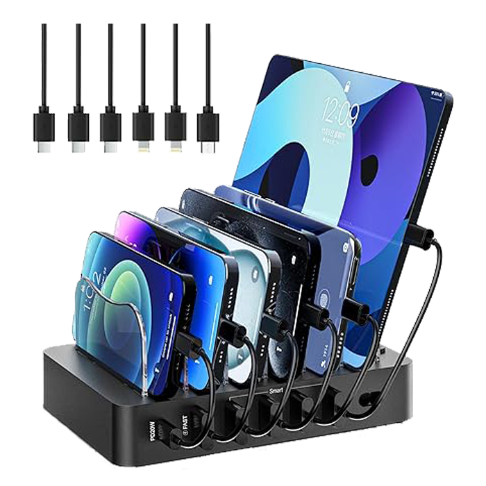 This compact USB-A charging station may help you neatly charge up to 6 devices simultaneously, offering a tidy solution to cable clutter. It comes with 6 cables, a smart watch charger holder (cable not included), and a Type-A to Type-C adapter. Delivering a maximum output of 2.4A per port, it may charge devices up to 80% faster than standard 2A chargers.